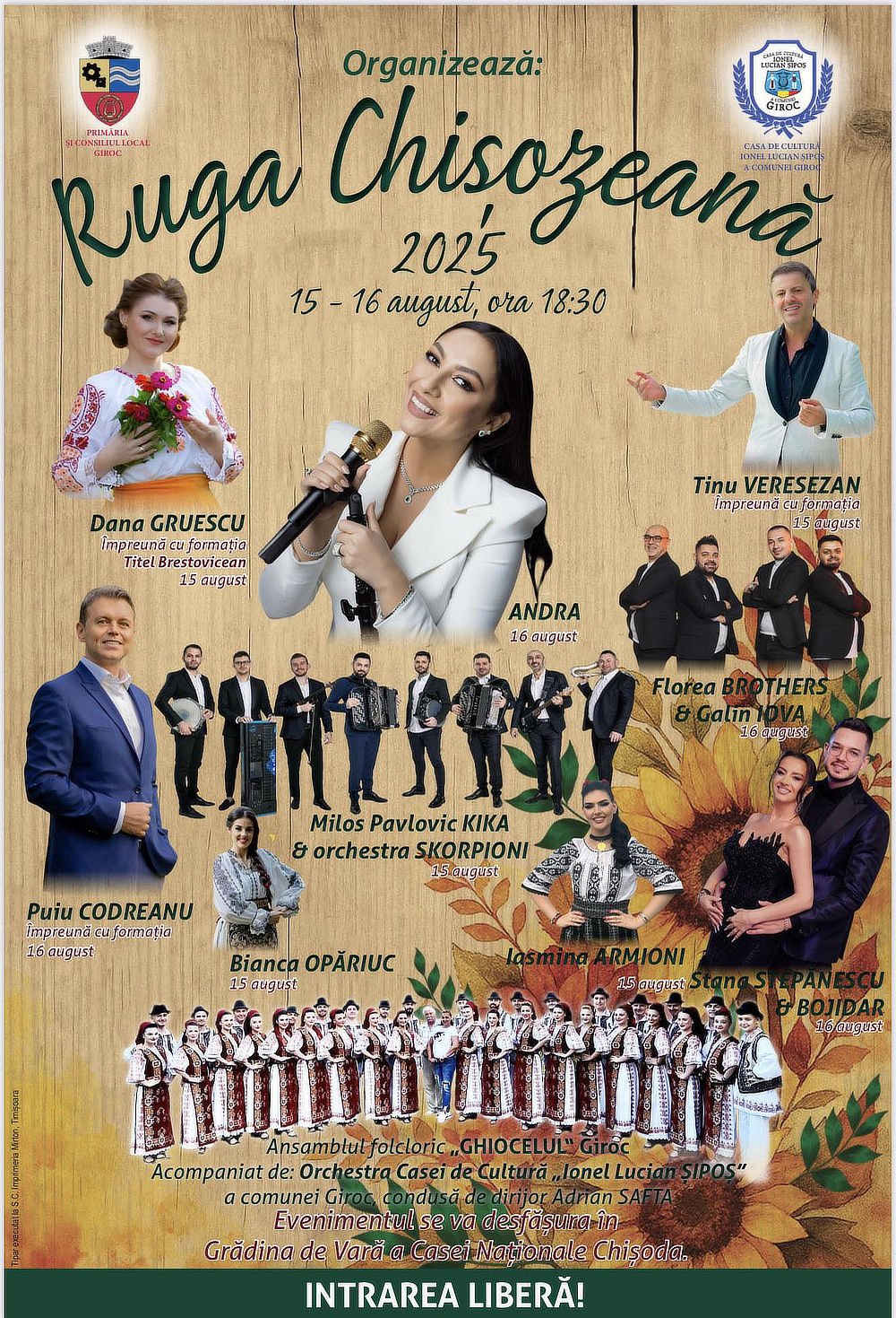 Organizatorii – Primăria și Consiliul Local Giroc, alături de Casa de Cultură „Ionel Lucian Sipoș” – au pregătit și pentru ediția din acest an un program artistic de excepție, desfășurat pe parcursul a două seri, cu intrare liberă.