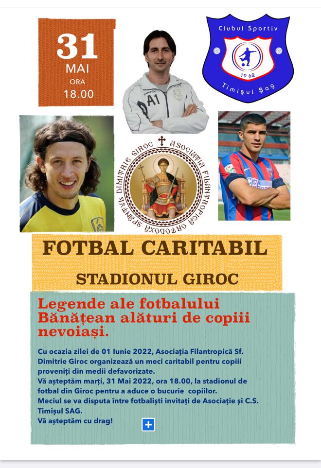 Marți, 31 Mai 2022, ora 18.00, Asociația Filantropică Sf. Dimitrie din Giroc, organizează un meci caritabil pentru copiii proveniți din medii defavorizate. Meciul organizat cu ocazia zilei de 1 iunie se va disputa între fotbaliștii invitați de Asociație și C.S. Timișul Șag.